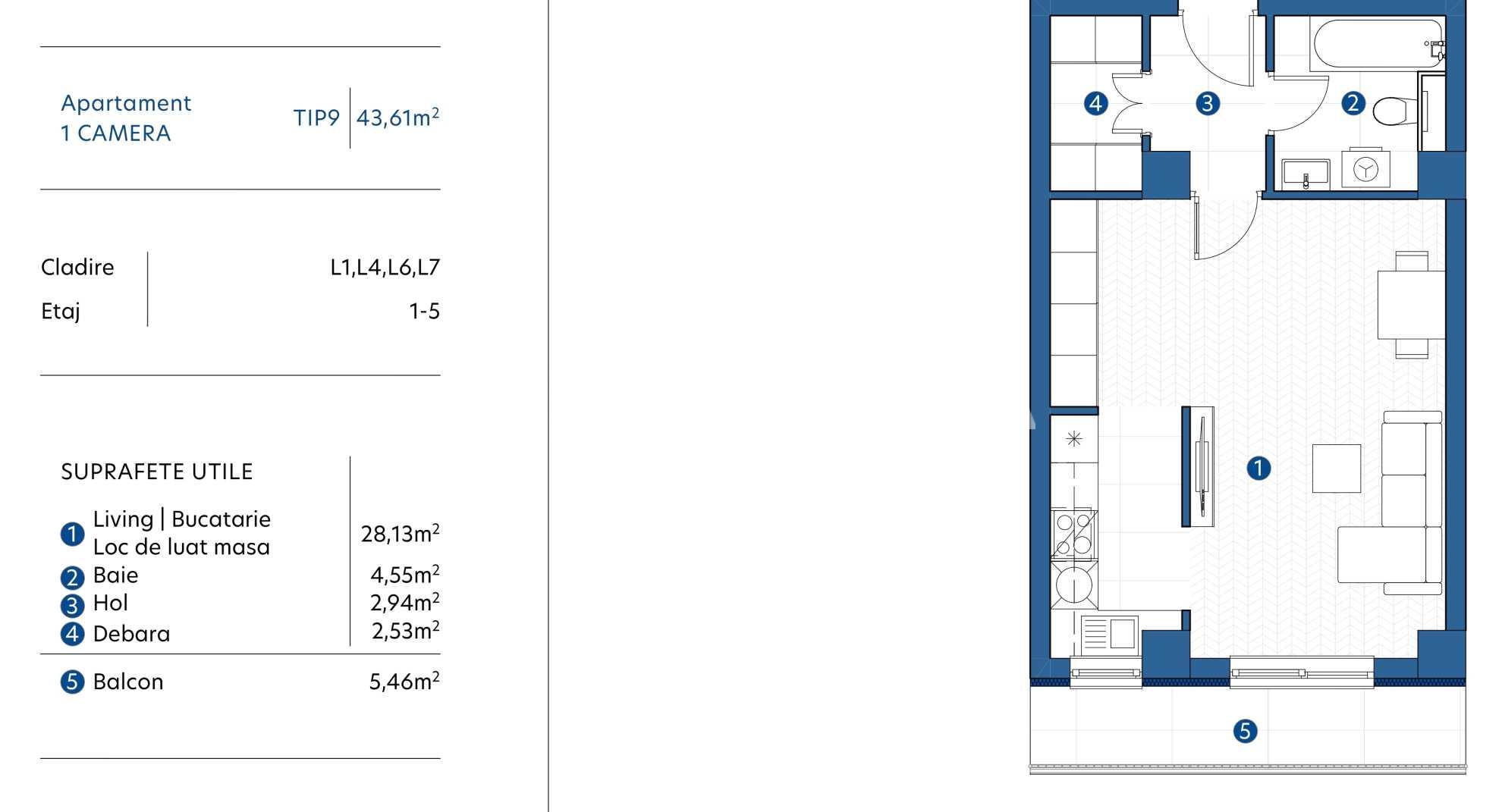 Apartament 1 camera, 46.3 mp - 70.197euro cu TVA 21% inclus - pret valabil la plata a 15% avans la antecontract si diferenta la predare